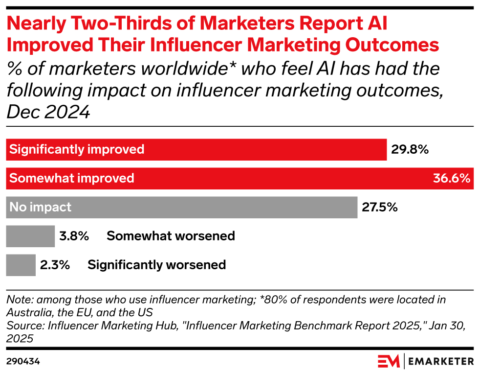 Key Stat: Most (66.4%) marketers who work with creators believe AI has at least somewhat improved their outcomes. But a sizable share (27.5%) believe it has had no impact, per December 2024 data from Influencer Marketing Hub.