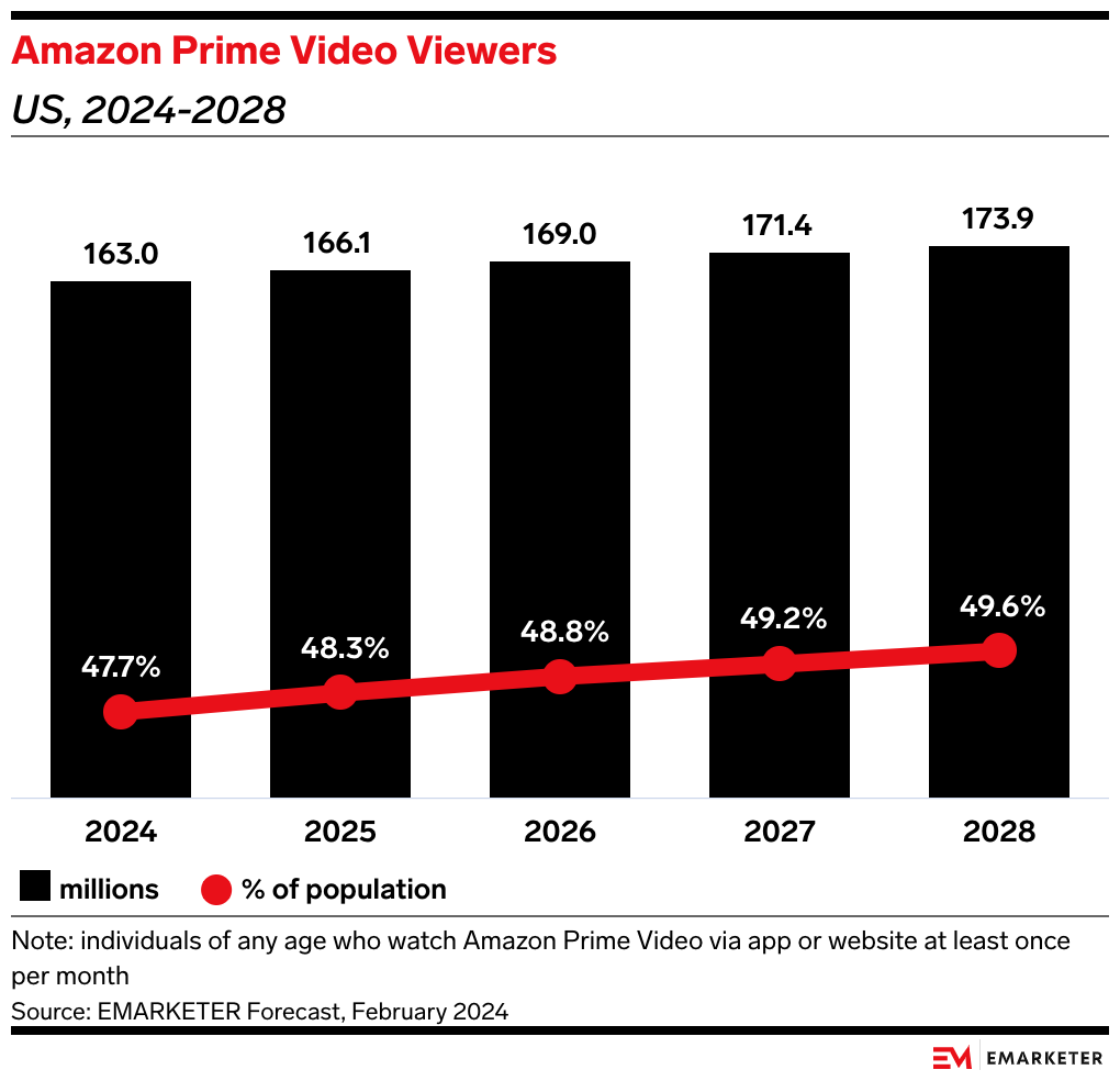 Meteoric rise: Amazon’s introduction of ads to Prime Video gave it a near-instant US ad-supported audience of 130.4 million (approximately 80% of Prime Video viewers), according to our February forecast. That figure dwarfs the ad-supported audience on streaming leaders Netflix and Disney, giving Amazon a major leg up in securing advertising commitments.