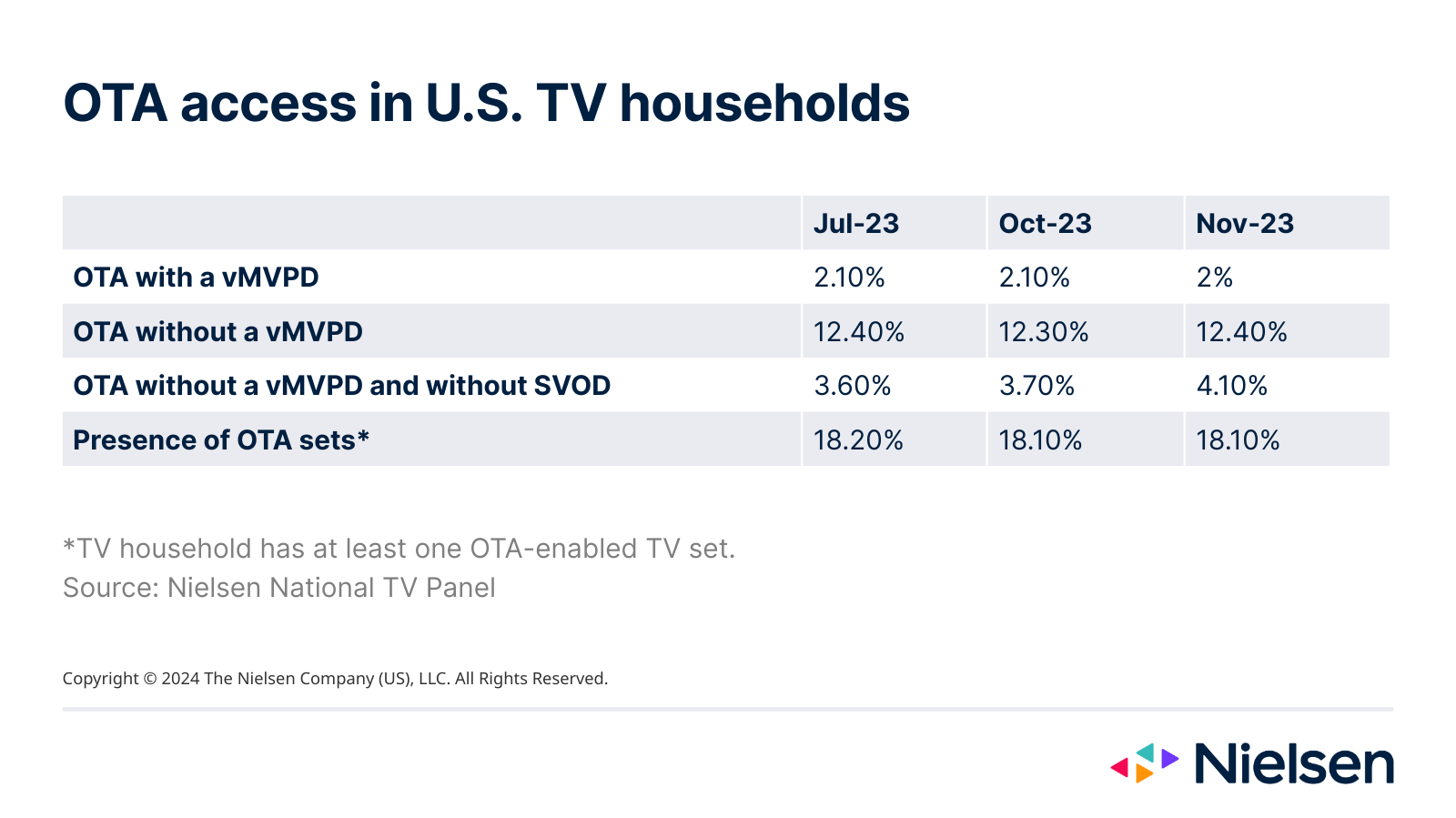Nielsen’s 2024 Upfronts/NewFronts Guide revealed that, as of November 2023, more than 18% of US TV households had at least one TV set enabled to receive free, broadcast programming. However, most households complement their OTA access with content they can access from other sources.