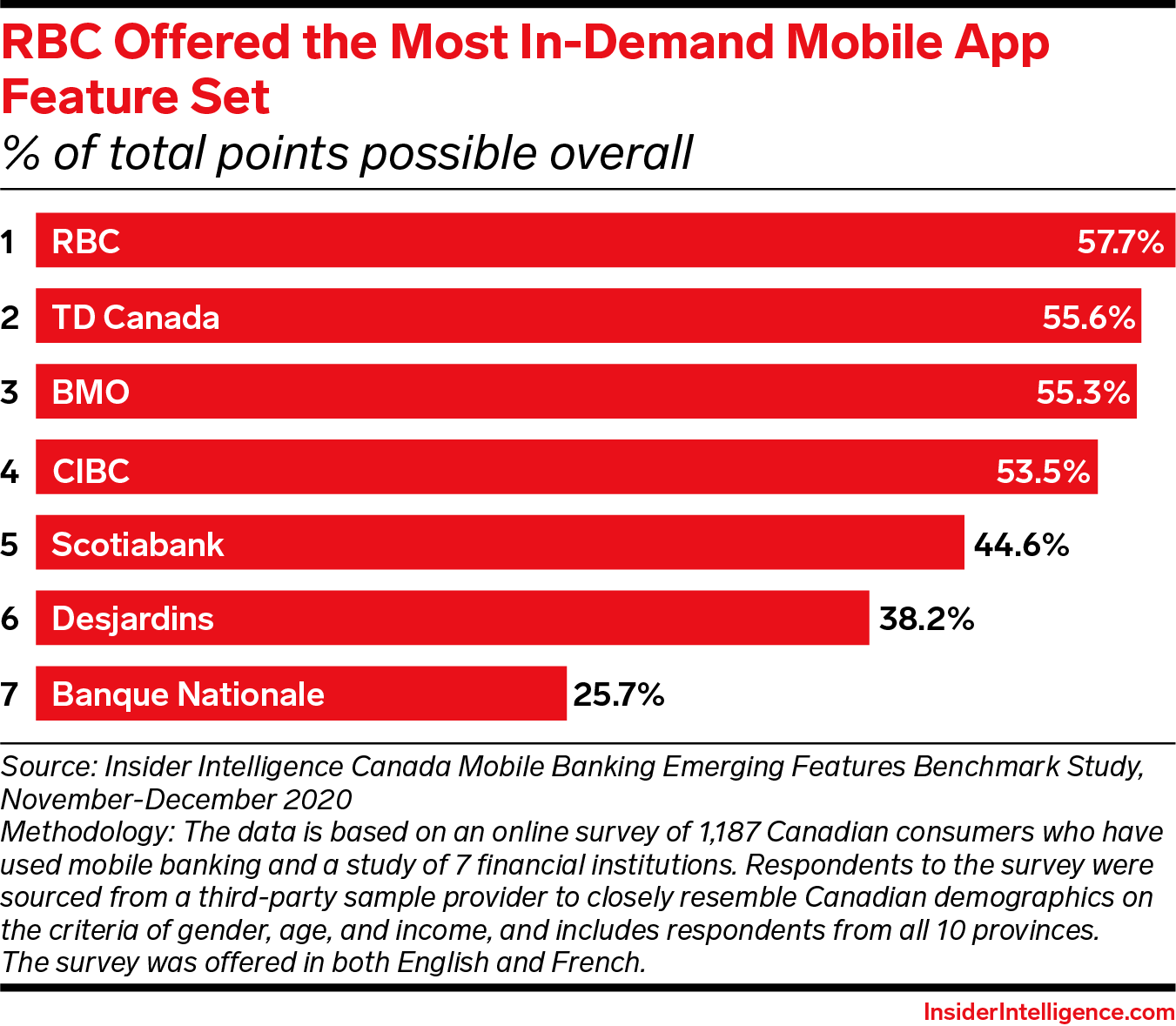 KEY STAT: RBC offered the most in-demand mobile feature set overall, scoring 57.7% of possible points in the study in a tight race—narrowly ahead of runner-up TD and two other close followers, BMO and CIBC.