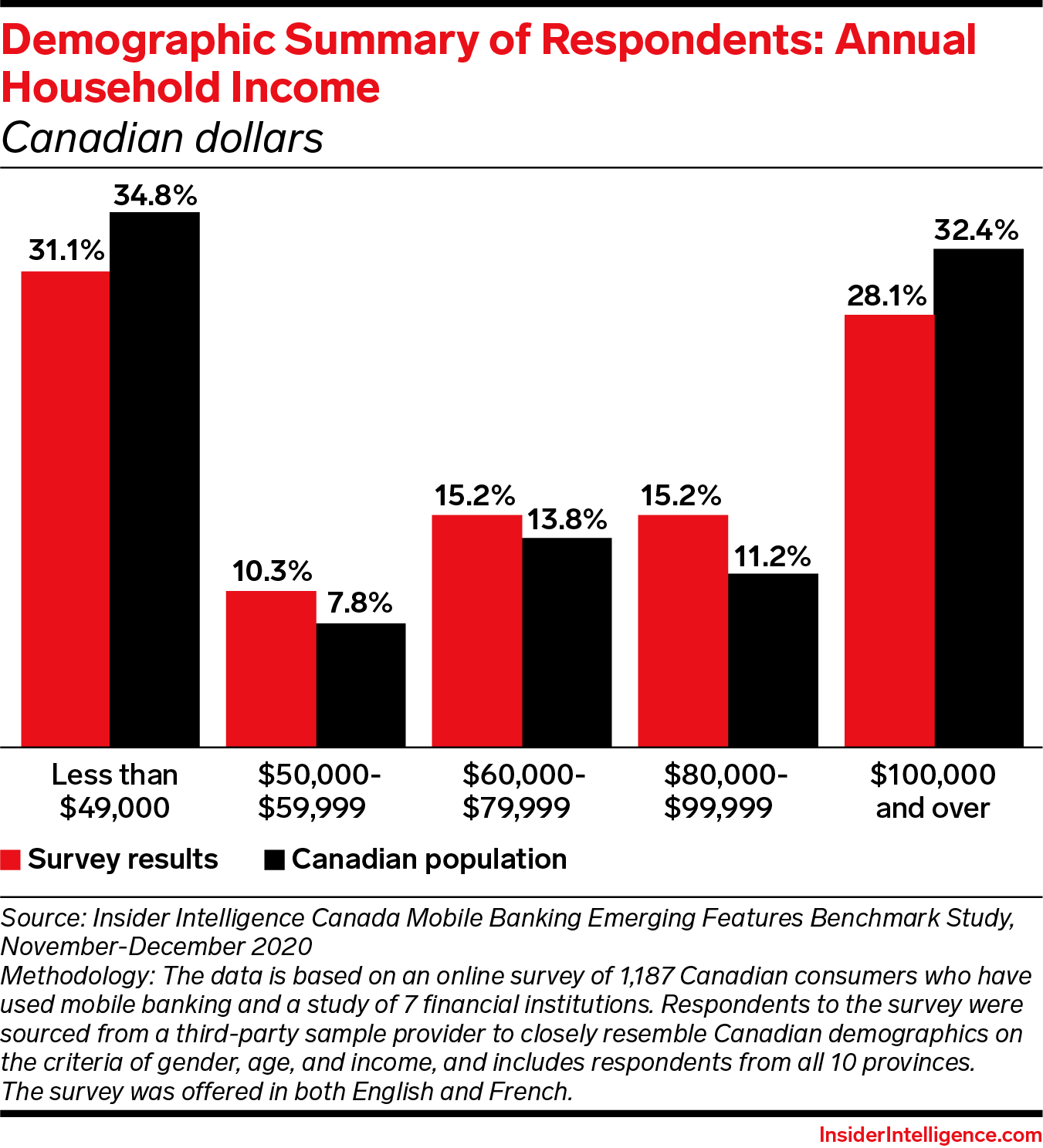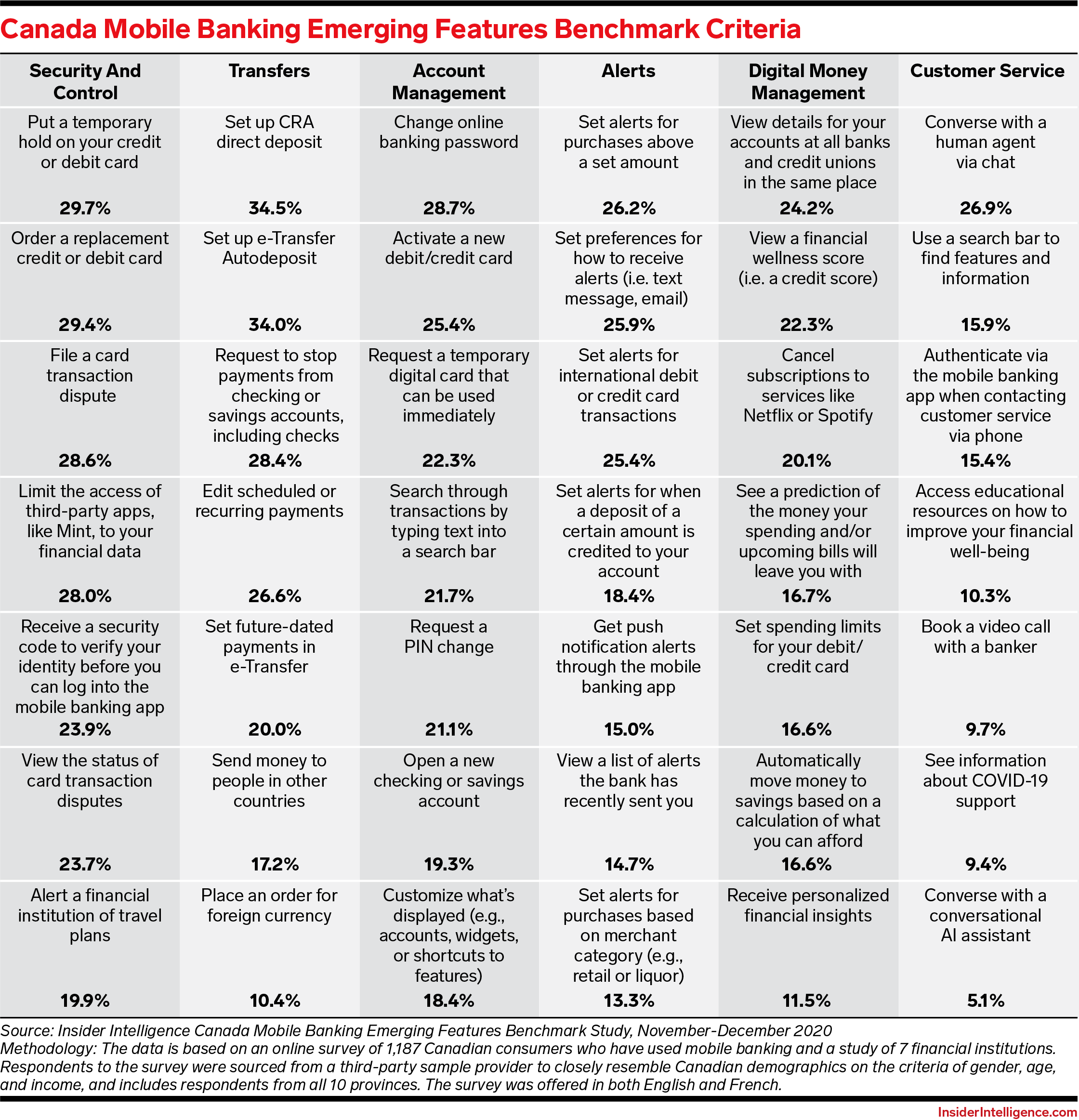 WHAT’S IN THIS REPORT? After an uptick in 2020, growth in smartphone banking adoption will slow to a trickle—and FIs can no longer rely on new smartphone owners to grow their ranks of mobile users. FIs will need to distinguish their mobile offerings to attract, engage, and retain customers. The Insider Intelligence 2021 Canada Mobile Banking Emerging Features Benchmark uses a dedicated survey of 1,187 Canadian consumers to identify the mobile banking features that consumers demand, highlighting features that the top seven Canadian FIs by assets deploy and the mobile functionality that consumers value most.