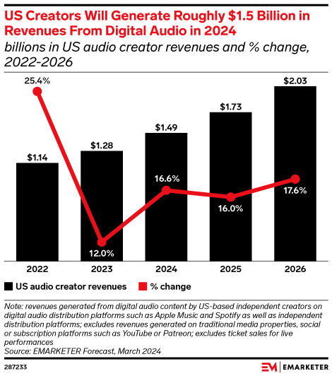 We expect US creators to generate $1.49 billion in digital audio revenues in 2024. That equates to just 10.9% of the $13.70 billion creators will earn on social media this year, but it’s up from $610 million in 2020. And those figures aren’t mutually exclusive. For example, we consider any revenues generated by creators via YouTube Podcasts to be social media revenues. Plenty of podcasters also post video clips of their recordings on social platforms, where they can be monetized.