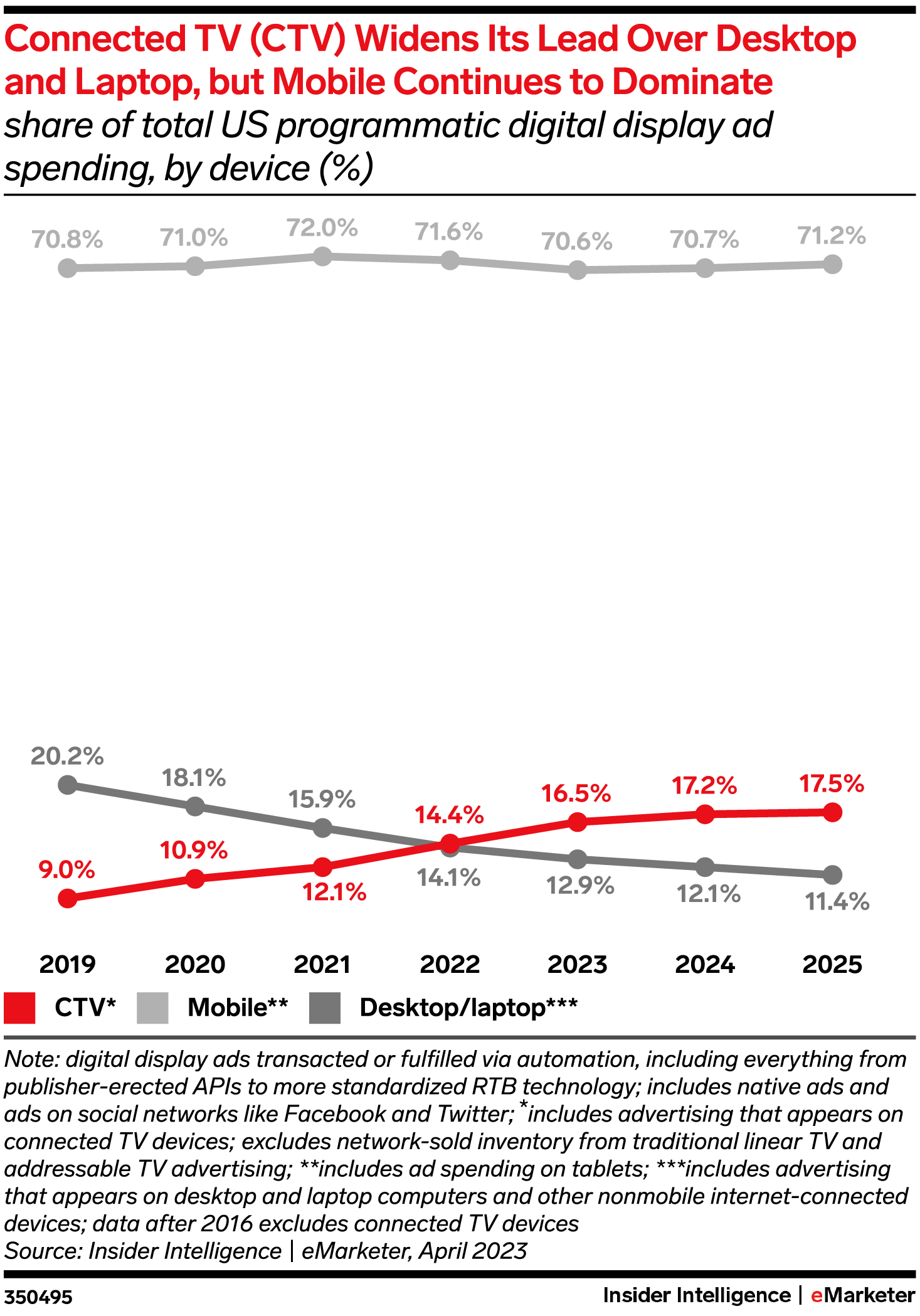 • As mobile picks up steam, CTV’s momentum will wane. CTV has steadily gained share of the programmatic digital display market since 2017 and has easily overtaken desktop and laptop. But it’s unlikely to dethrone mobile as the king of programmatic. And as social networks continue to recuperate from Apple’s privacy changes, mobile will start gaining share of total programmatic ad spending once again.