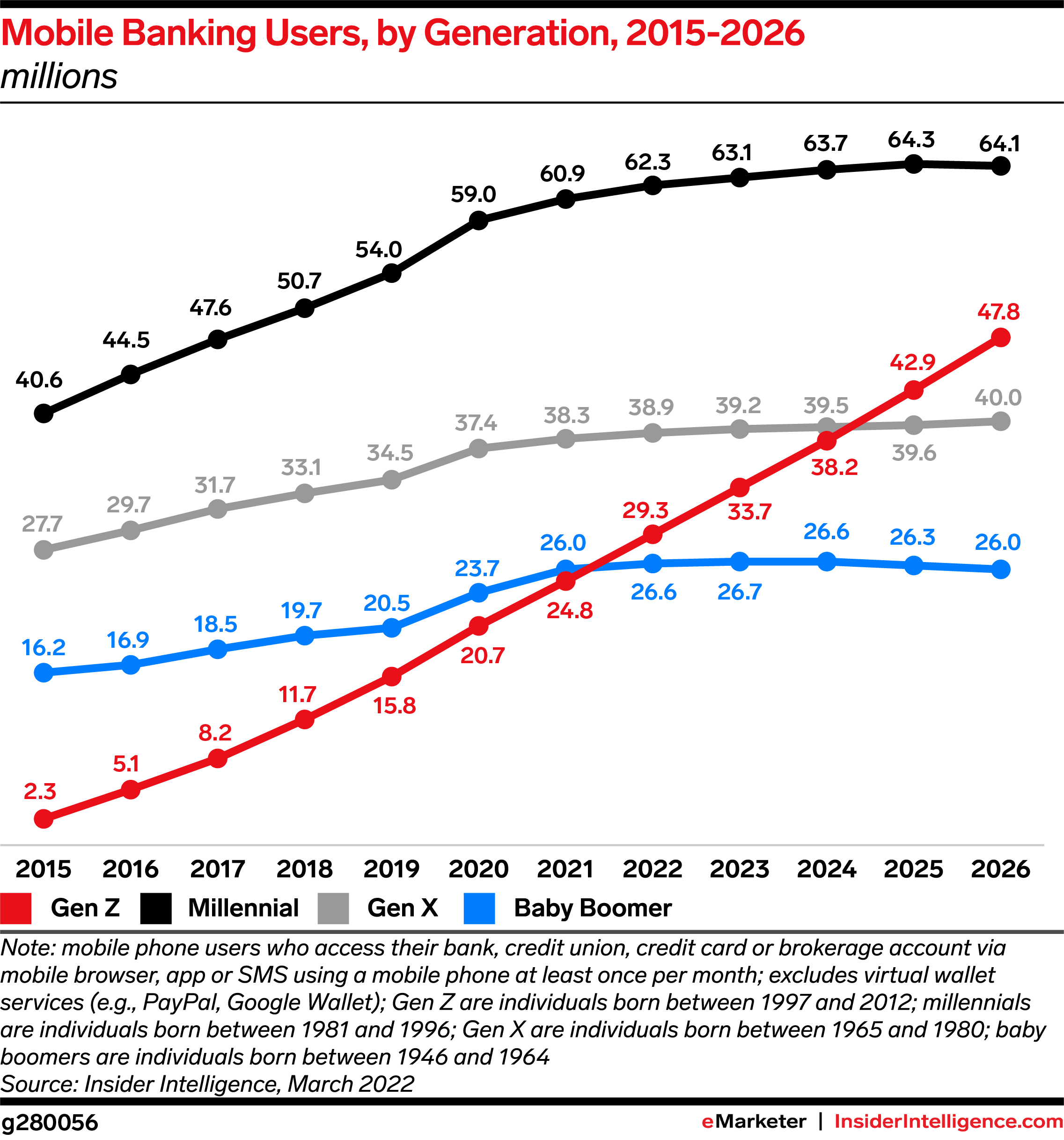 KEY STAT: Gen Z mobile banking adoption will reach 33.7 million consumers in 2023 and will continue to rise sharply, at a compound annual growth rate (CAGR) of 12.4% through 2026.