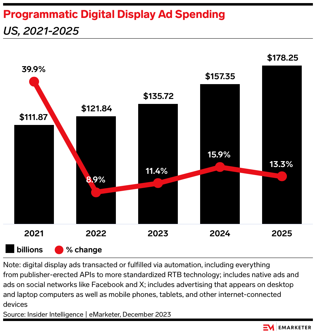 Programmatic is on track to capture a growing share of ad dollars as advertisers embrace the flexibility and control that comes with automation. Bolstered by the growth of connected TV (CTV), programmatic will account for 92.1% of digital display ad spend and 89.4% of video ad spend in the US by 2025, according to EMARKETER’s December 2023 forecast.