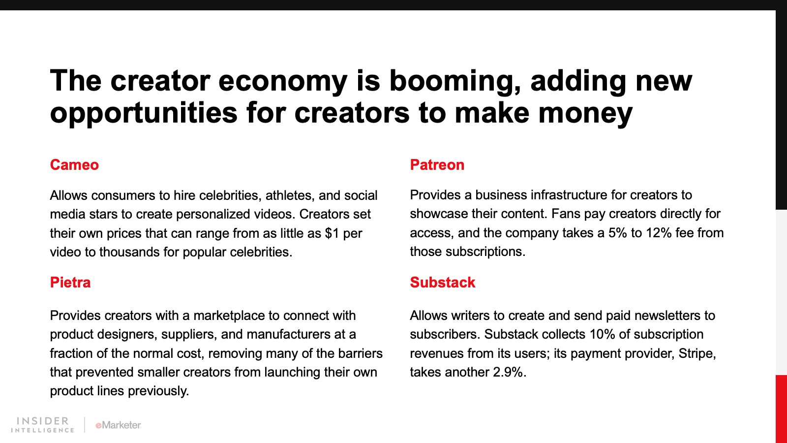 WHAT’S IN THIS REPORT? This report explores how the growth of the creator economy will affect brand-influencer partnerships, and how marketers should adapt their strategies to attract creators as their revenue streams diversify.