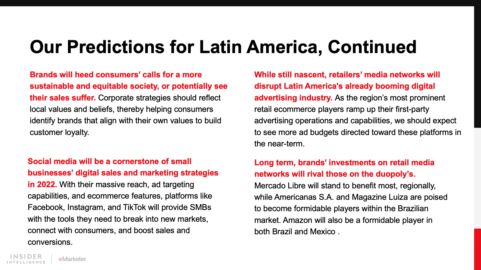 Latin America is no stranger to change, but consumers’ quick embrace of new digital habits grew at an unprecedented rate and scale like never before during the pandemic. In 2022, expect a surge in digital payment adoption, a change in consumer expectations around ecommerce, a struggle with sustainability issues, an embrace of social media by small businesses, and the rise of retail media networks in Latin America.