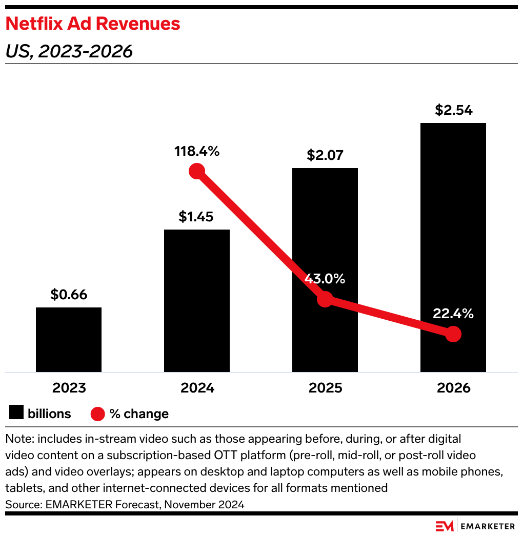 • Netflix launched its ad-supported tier with Microsoft as its technology partner but has gradually moved away from the tech company. It launched its own ad system in Canada last year, where Peters noted revenue gains.