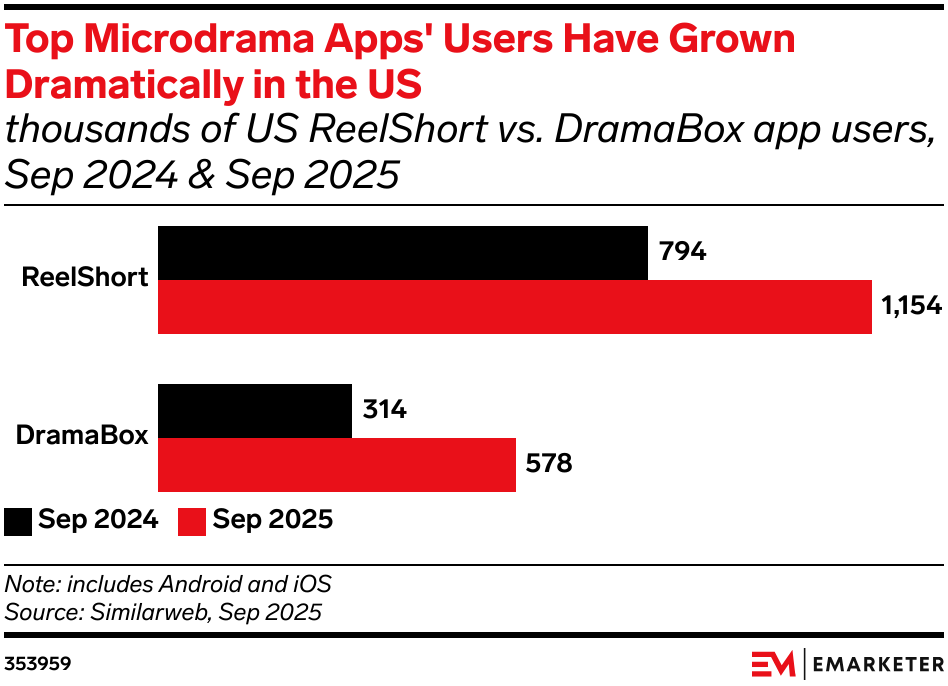 Key Stat: Top microdrama apps’ user bases in the US have grown significantly; ReelShort, one of the most popular microdrama apps, has about 1.2 million US viewers as of September 2025, up from around 794,400 in September 2024.