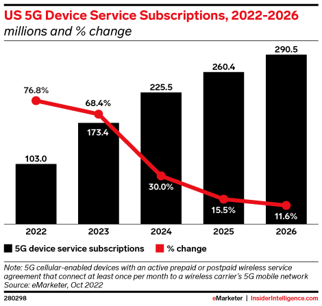 KEY STAT: With networks expanding and users jumping on, 5G device subscriptions in the US will grow to 290.5 million by the end of our forecast period in 2026.