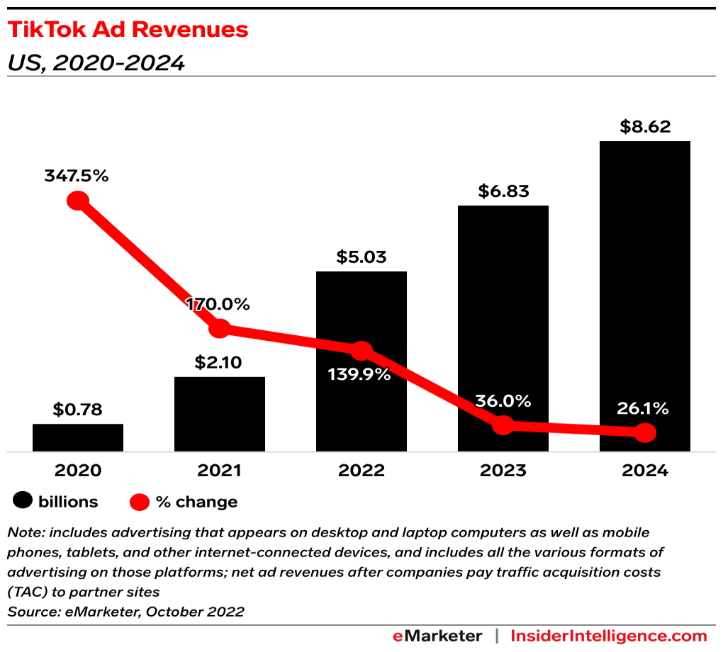 • This year, TikTok’s US ad revenue will surpass $5 billion, roughly equaling that of Snapchat, Twitter, and Reddit combined.