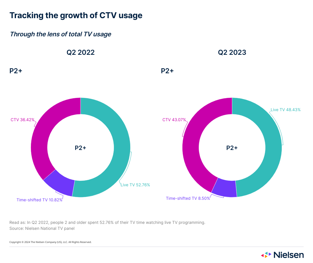 The increasing engagement is directly connected with growing access. Today, CTV devices reach 75% of people ages two and older, according to Nielsen’s Q2 2023 National TV Panel. That’s up from just 58% at the start of 2020. The penetration of smart TVs, which often come with pre-installed apps that provide direct access to streaming content, is also nearing ubiquity: More than 70% homes now own a smart TV.
