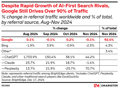 OpenAI’s SearchGPT is growing fast and has sent four times the referral traffic as Perplexity in October 2024, according to BrightEdge. But it still remains tiny next to Google’s referral traffic. A longer-term threat to Google could be Meta AI search, but details on Meta’s plans remain vague.