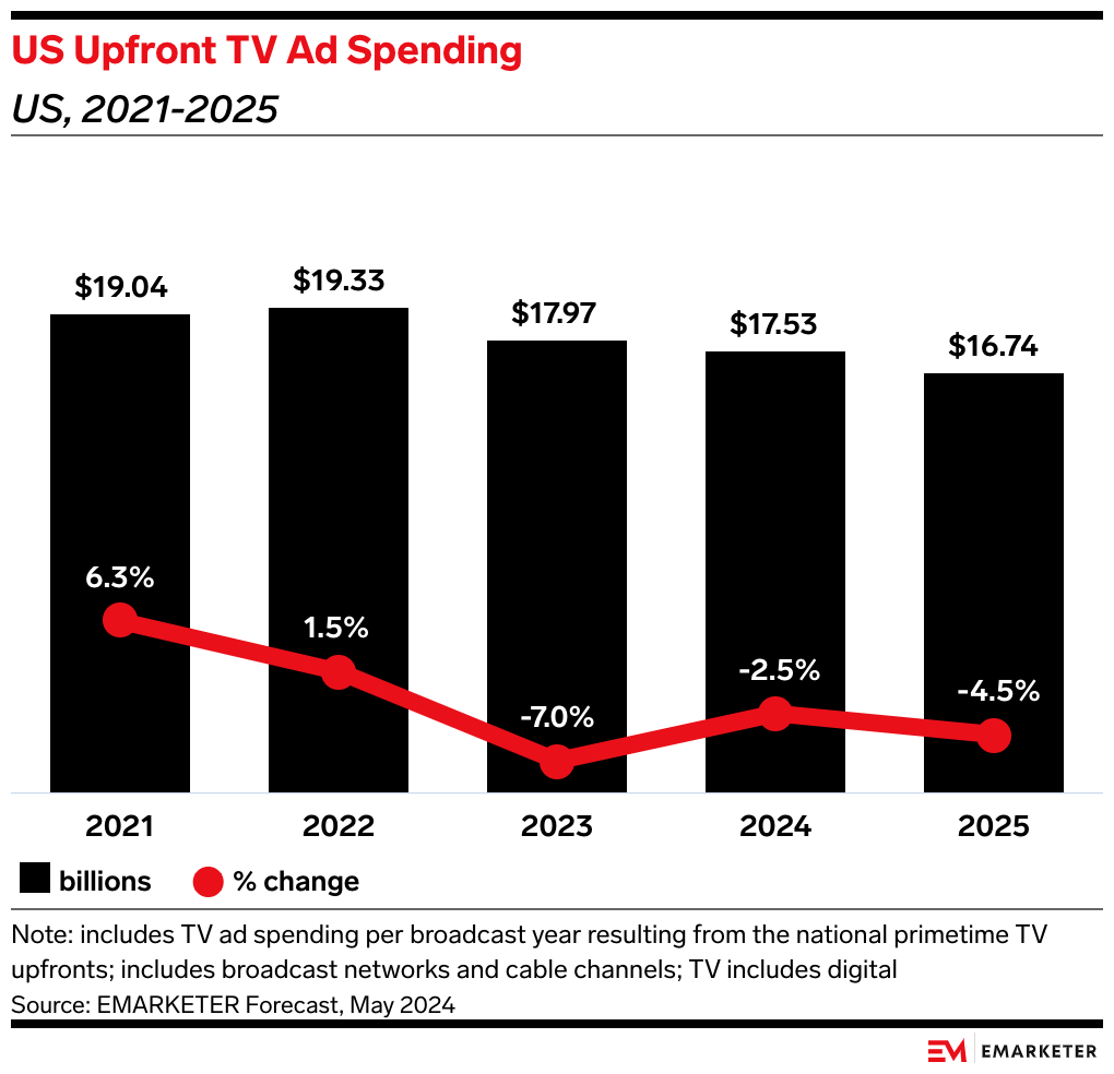 - Upfront linear TV spending is declining in tandem with total linear TV ad spending. Between 2021 and 2024, US linear TV ad spending had a negative 3.5% CAGR. During that period, upfront TV had a negative 2.7% CAGR.