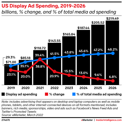 KEY STAT: After record-breaking growth in 2021, display ad spending will increase by 20.9% to $143.55 billion in 2022.