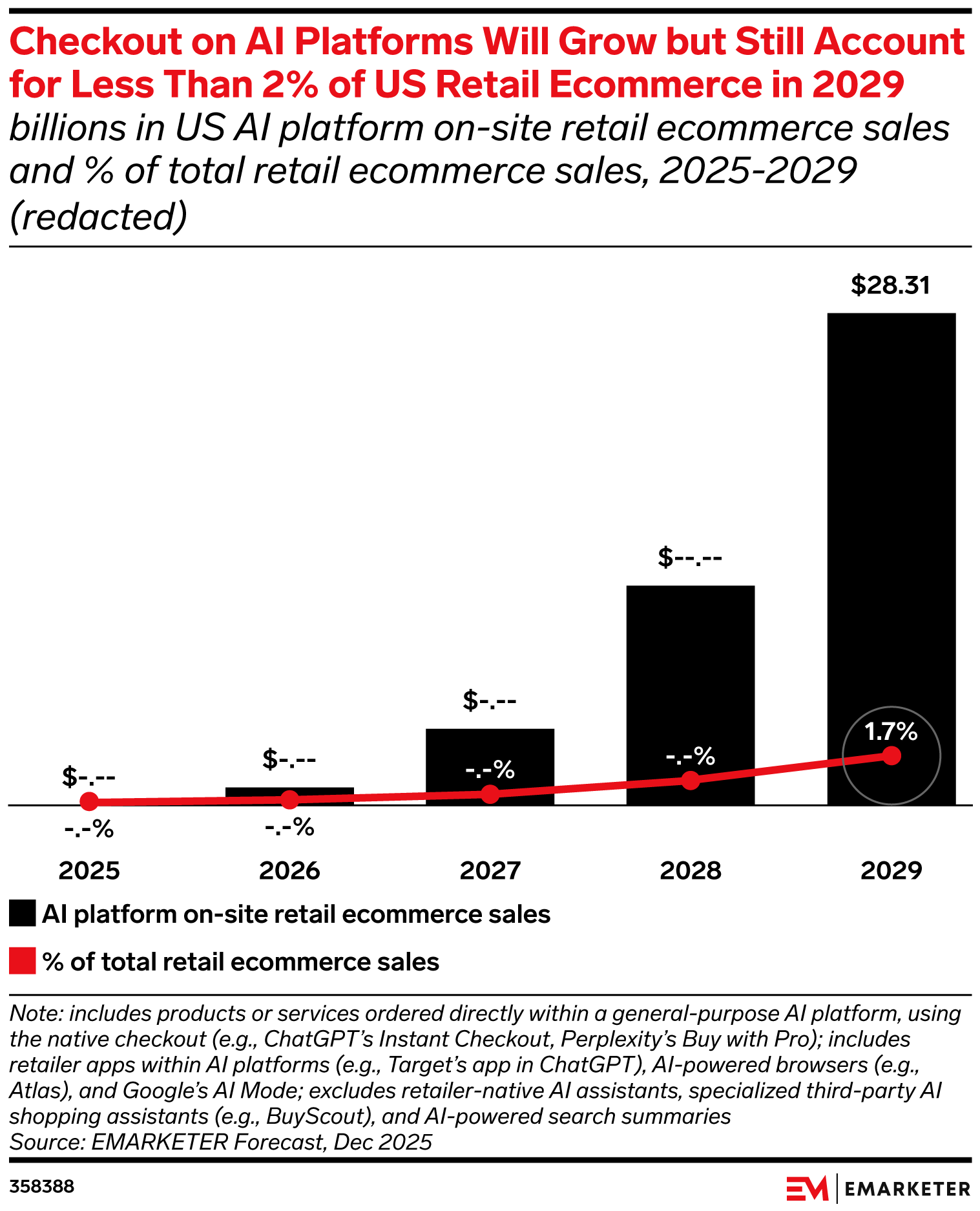 Key Stat: AI platforms are starting to drive sales, but little of that spending happens directly on AI platforms. On-platform sales will make up just 1.7% of US retail ecommerce spending in 2029.
